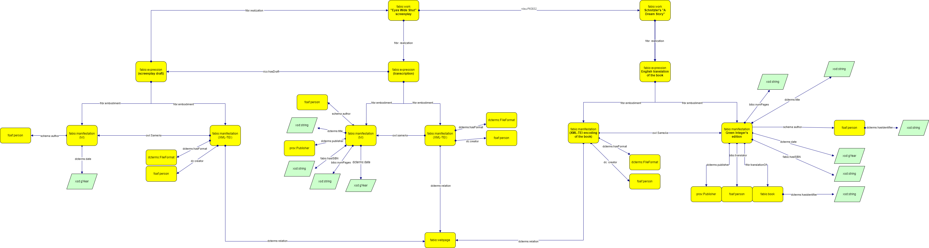 - fabio:manifestation is the materialization of the entity, in our case the book version that has been published by Green Integer, the XML-TEI encodings, the transcription of the movie published in 1999 and the draft screenplay.